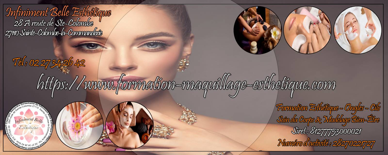 Centre de Formation en maquillage, en onglerie, en soins du corps, en beauté du regard, en modelage, en aide aux examens pratique Esthétiques et Institut de Beauté Infiniment Belle Esthétique, 28a route de Sainte-Colombe 27110 Sainte-Colombe-la-commanderie, téléphone 02 27 34 26 42, Siret : 812 777530 00021